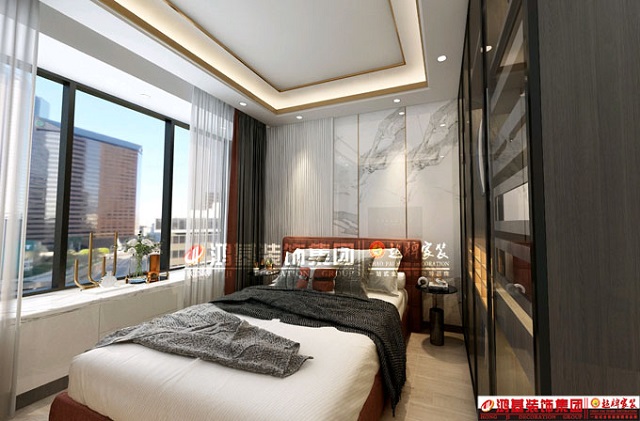 圖5.亮點:為避免單調(diào),主臥床頭背景采用護墻板結(jié)合鈦金條的設(shè)計,頂面吊頂相互呼應(yīng)。
